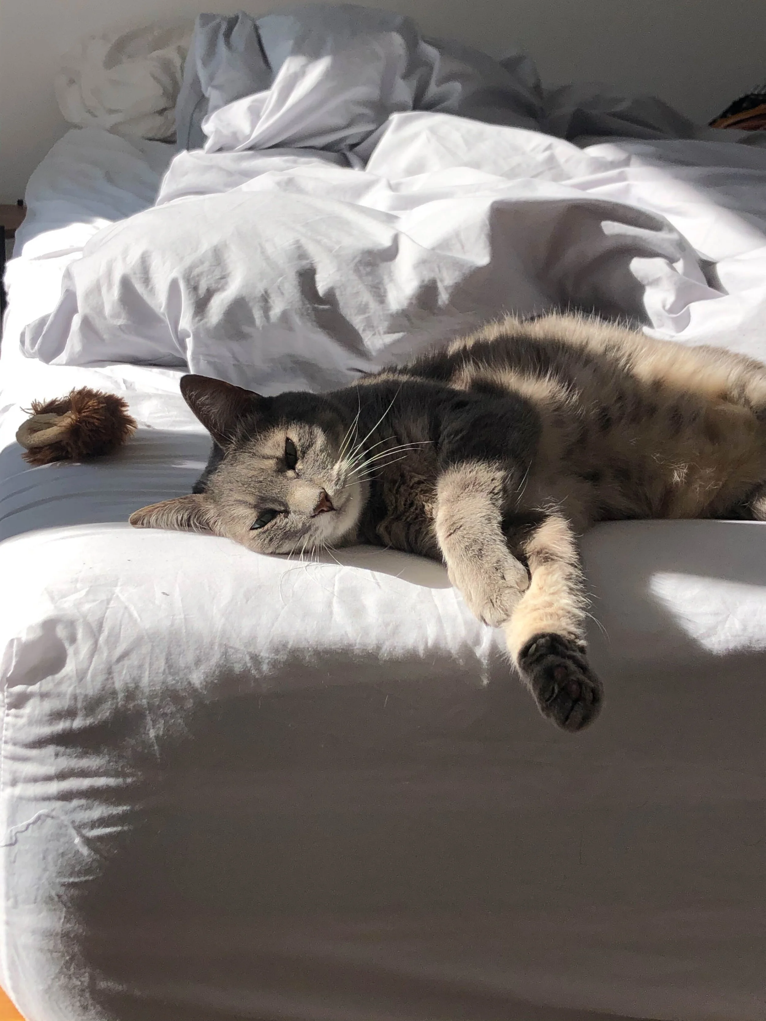 Tuna will find any ray of sunshine and park herself there for hours. This is usually paired with the aforementioned nap or staring out the window and plotting against the pigeons. She’ll stretch out, take up space, and take it all in.