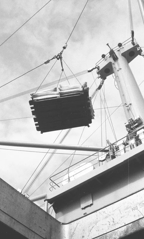 Brian Nelson. Roy, at the controls of the winches (at right), hoists the load out of the cargo hold. Roy was a London Docker prior to immigrating to San Francisco.