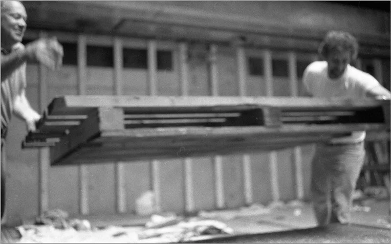 Ed Nelson (my brother) and partner reach into a tight corner, winding up for a 6-foot toss onto a pallet board.