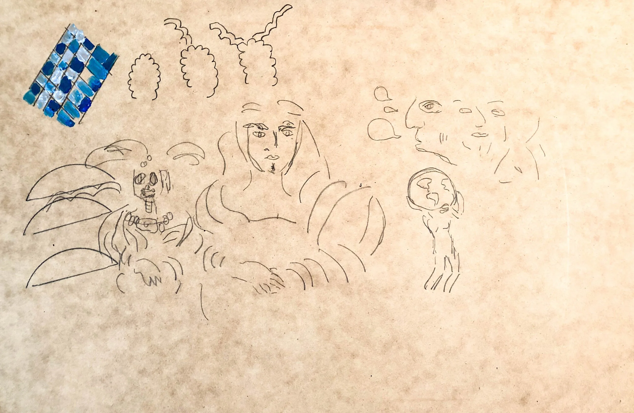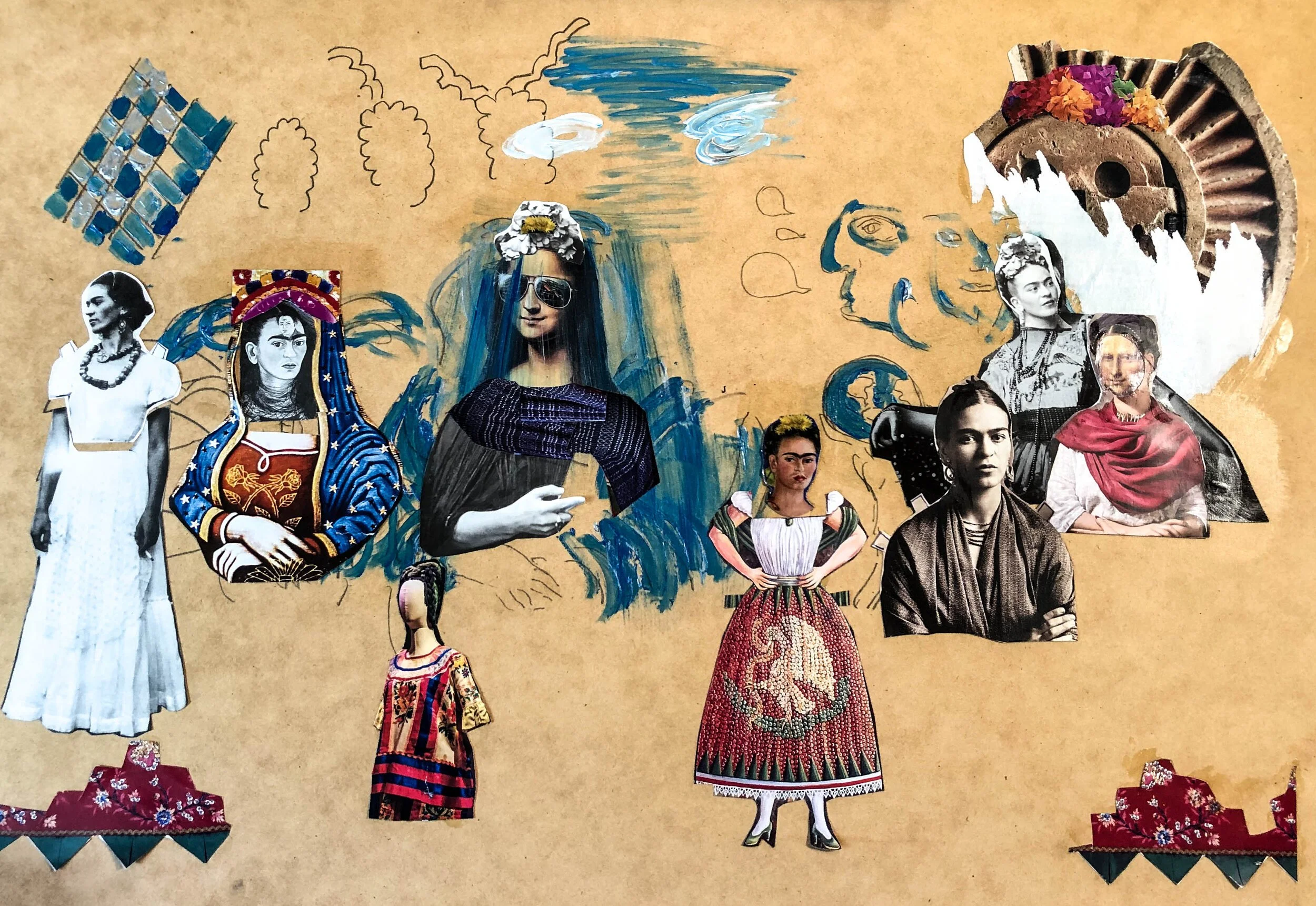 I started with a silly sketch of the Mona Lisa, because I planned to merge Frida with Mona (but about 90% Frida) because somehow the theme of becoming was there.