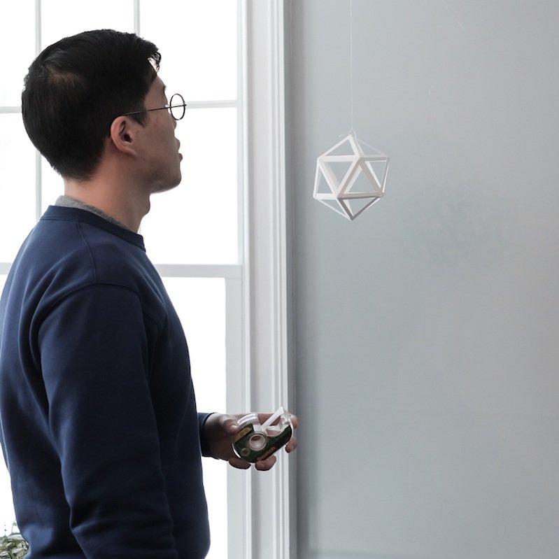 “I haven’t created anything with my hands for a very long time. When I was a kid, my mom and dad got me origami books. There were two large volumes. At the end, the most difficult origami were the modular origami.Taking one root piece, you replicated it many times and created giant three dimensional shapes. Taking the ‘Roots’ theme from the Art Junket, I took the idea that there would be one ‘root’ that shared and created many things from it.There are five Platonic solids. They are geometric figures. The faces are all equilateral. They are all equilateral triangles, squares, or pentagons.” (Frankie Lee, Member of Art Junket East, 2019)